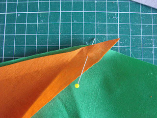 Można zacząć od tego ze wycinamy tło całego prostokąta z dodatkiem oczywiście na szwy i później doszywamy boki, czyli dwa trójkąty